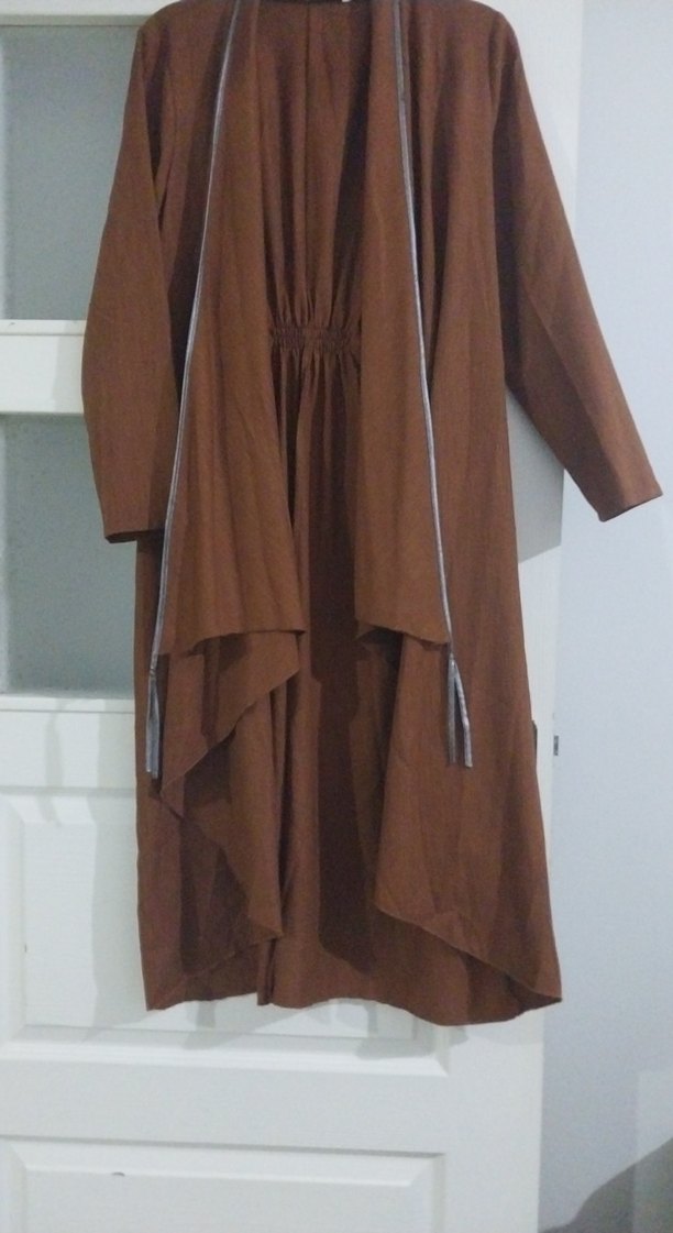 Kahverengi uzun , dökümlü tasarım ve bol kesimle dikkat çeker. Uzun kollu, yakası kesik ve keten kumaştan yapılmıştır, minimal ve çağdaş bir tarza sahiptir.