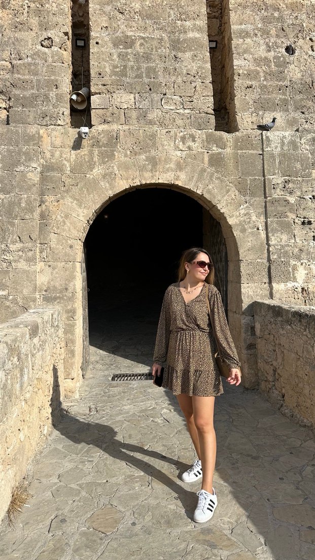 V yaka ve uzun kollu, dökümlü elbise. Kahverengi ve siyah renkli leopar desenli , sokak stili için uygun.