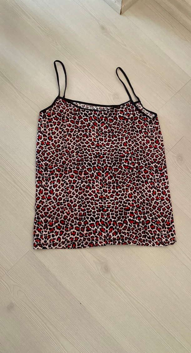 Kadınlar için ince askılı, koyu kırmızı tonlarda cesur leopar desenli, dökümlü kesime sahip sentetik kumaştan bluz.