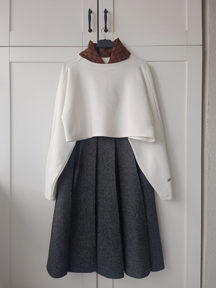 Gri renkli, dökümlü ve bol kesim mini hamile eteği, günlük kullanım için Paris normcore tarzında tekstil kumaştan üretilmiştir.