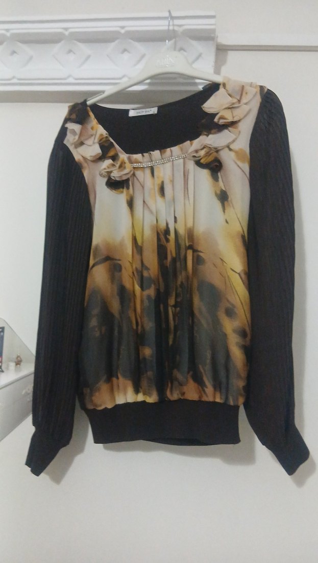 Kadın bluz, uzun kollu ve yuvarlak yakalıdır. Pilili detaylar ve koyu kahverengi tonlarda batik deseni bulunur. Rahat, kısa ve dökümlü kesimdedir. sifon kol lastıklı bel kol