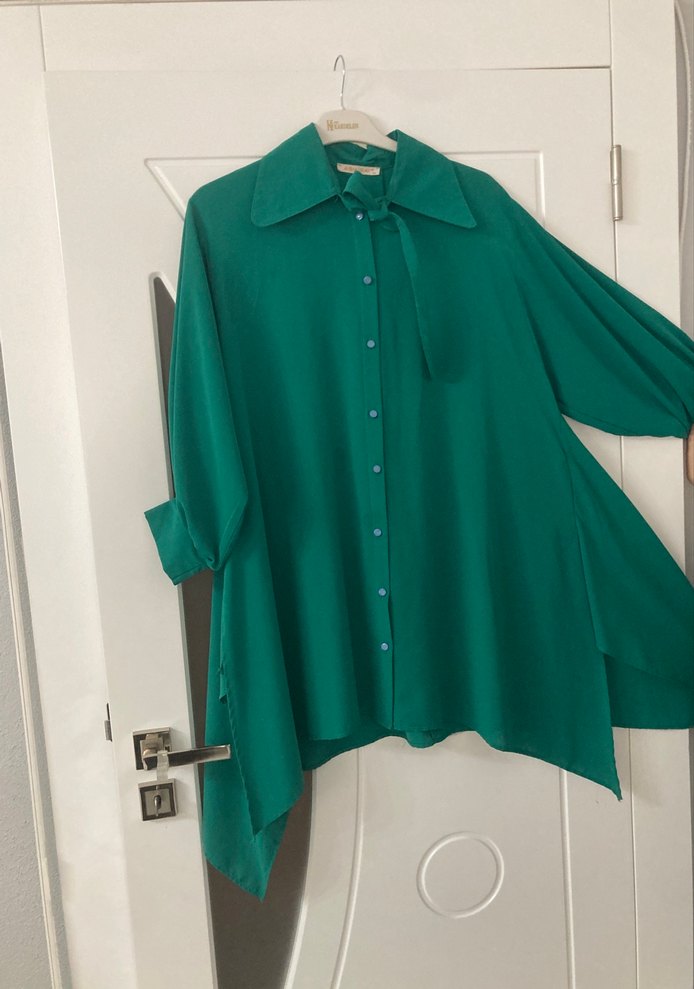 Dökümlü kesim, uzun kollu ve yakalı kadın gömleği. Önü düğmeli, uzun boylu ve parlak yeşil, ipeksi kumaştan. Minimalist, çağdaş tarzda günlük kullanım için uygun.