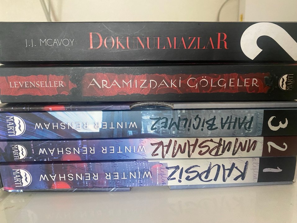 Dokunulmazlar ve Aramızdaki Gölge adlı romanlar, farklı yazı ve renkte kapakları ile birlikte görülüyor. tekli de satılır