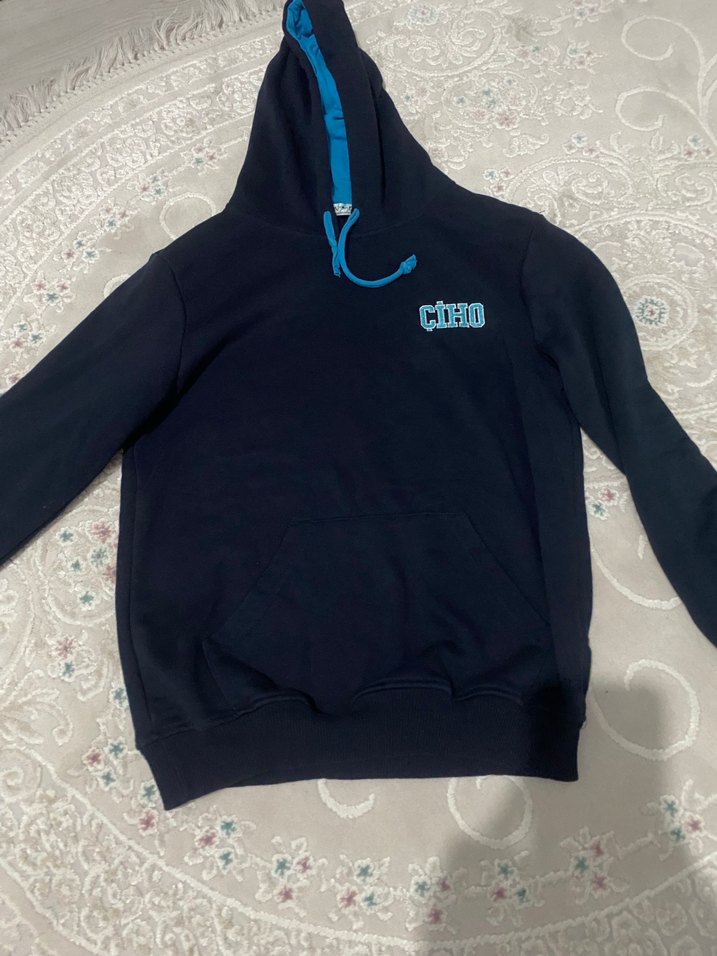 Kapüşonlu, uzun kollu, fermuarlı ve baskılı 'CIHO' yazılı, yumuşak ve sıcak kumaştan yapılmış mavi renkli dar kesim kadın sweatshirt.