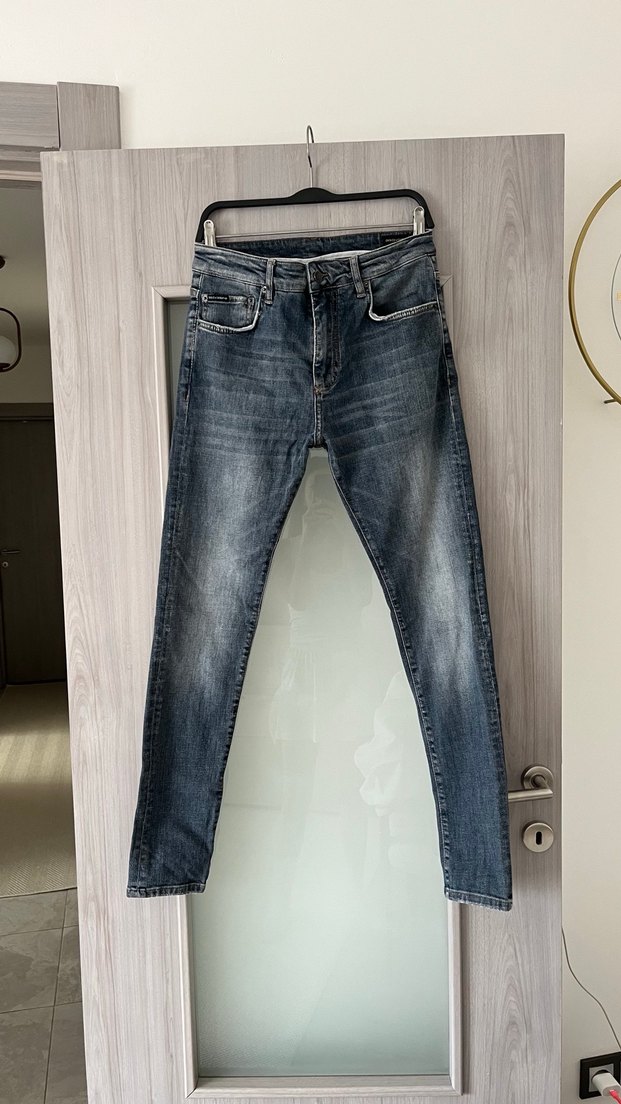 Gri-mavi renkte, regular fit ve normal boyda, dayanıklı denimden üretilmiş erkek jean. Sokak stiline uygun, günlük kullanıma ideal, tokalı detaylı. Hiç kullanılmadı sorunsuz tüm ayrıntılar fotoğraflarda. Dolce, İtalyan bedeni kullandığı için 46 yazıyor fakat 36 beden uyumludur.