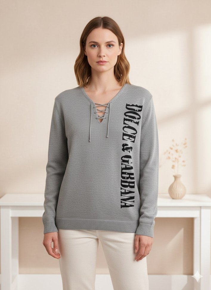 Dolce Gabbana Gri V Yaka Bağcıklı Kadın Triko Kazak