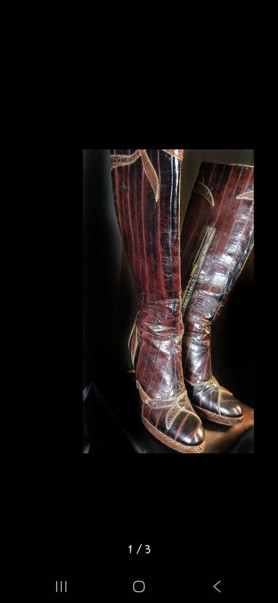 Koyu kahverengi yılan desenli deri diz boyu çizme, ince topuklu ve tokalı detaylara sahip, avangart tarzda.