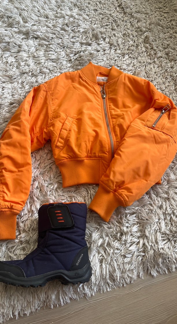 Bu turuncu kısa mont, yüksek yakalı ve uzun kolludur. Sıcak tutan yumuşak kumaştan yapılmış, fermuarlı ceplere sahiptir. Çocuk ceketidir.
