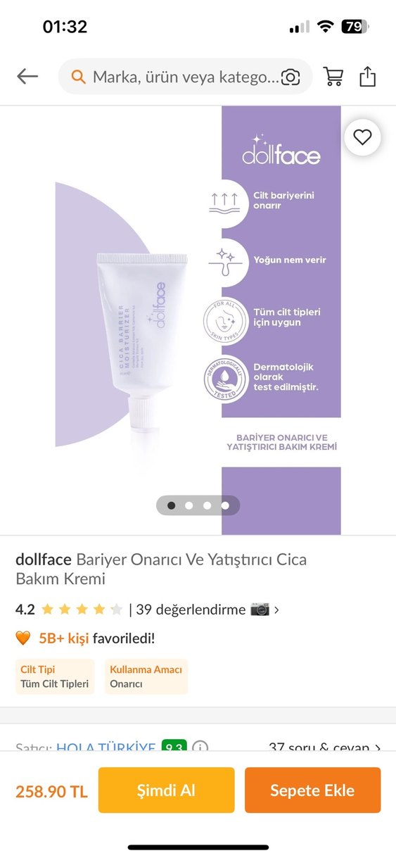dollface Bariyer Onarıcı ve Yatıştırıcı Cica Krem cilt bariyerini onarır ve yoğun nem sağlar. Tüm cilt tipleri için uygundur, dermatolojik olarak test edilmiştir.