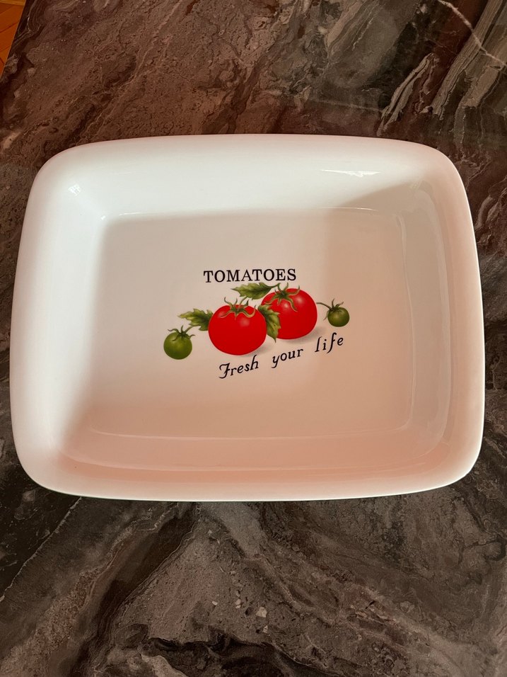 Üzerinde domates ve "TOMATOES Fresh your life" yazısı bulunan beyaz porselen fırın kabı