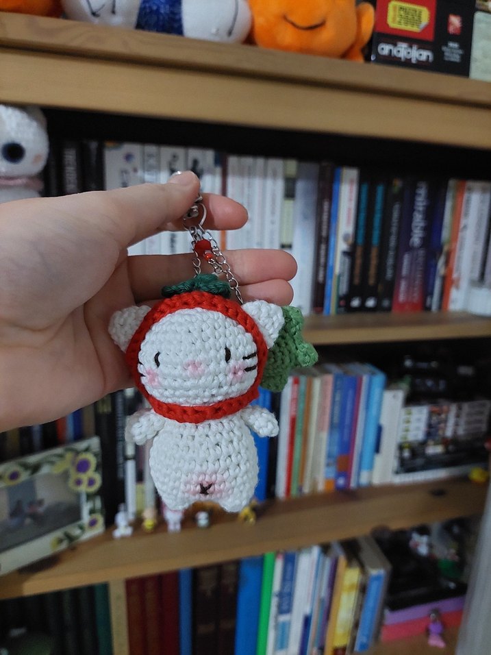 Domates Şapkalı Örgü Kedi Charm Anahtarlık