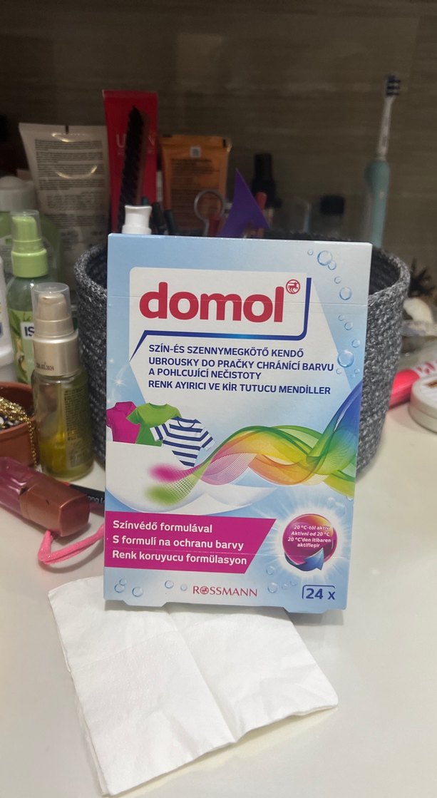 Domol renk koruyucu formül ile renkleri koruyan ve kirleri gideren 24 adet çamaşır mendili. Bazen farklı renkli çamaşırları yıkarken renklerin diğer çamaşırları boyamamasını sağlayan sihirli mendil ⭐️