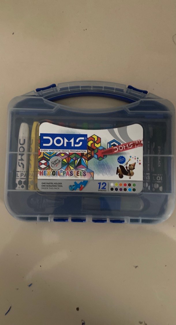 DOMS pastel boya seti, 12 canlı renkten oluşur ve taşıma saplı sağlam plastik kutudadır. İçinde kazıma aracı bulunur.