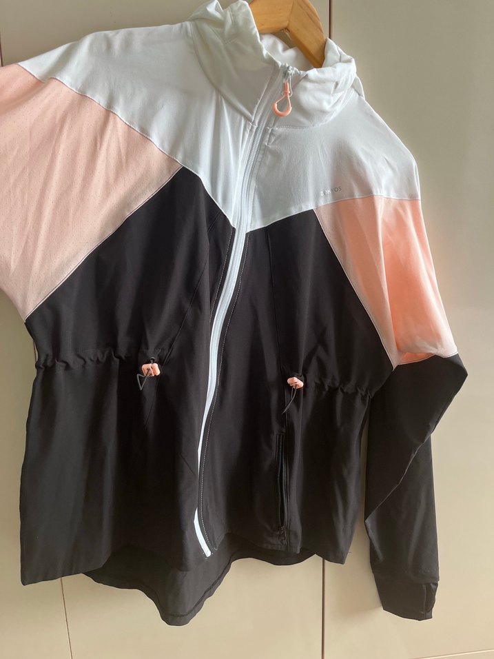 Domyos Pembe ve siyah renklerde, uzun kollu, yüksek yakalı, fermuarlı spor ceket.