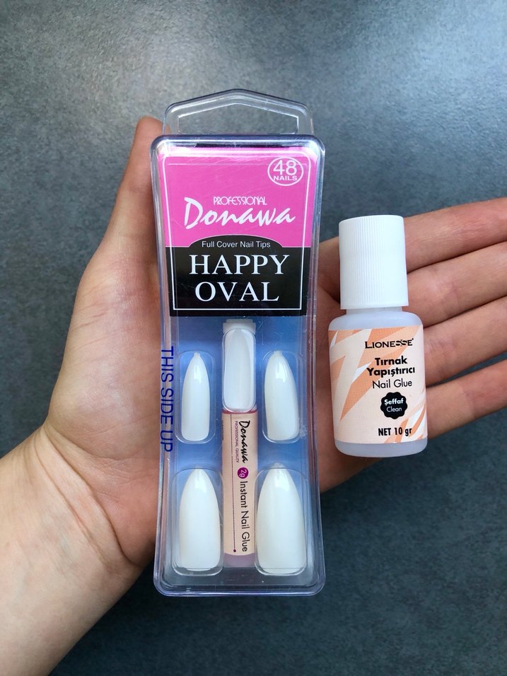 Tırnak yapıştırıcısı ve takma tırnaklar. Tırnak yapıştırıcısını kullanmadım. Takma tırnaklarda çok azını kullanmıştım