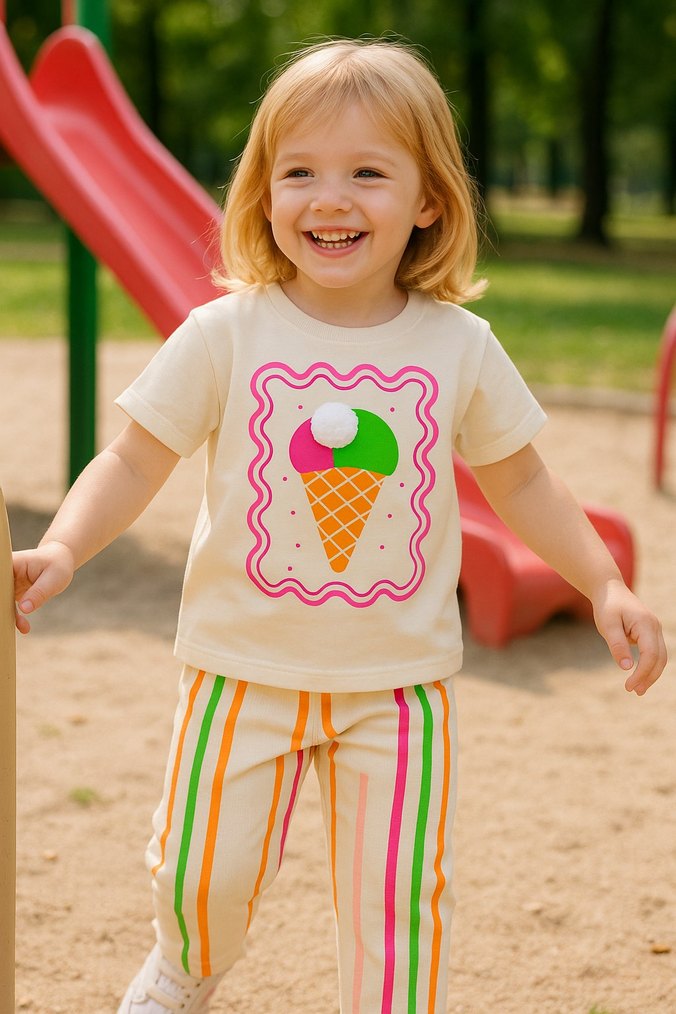 Kısa kollu, yuvarlak yaka, Renkli dondurma baskısı bulunur. Yumuşak pamuklu kumaştan üretilen takım