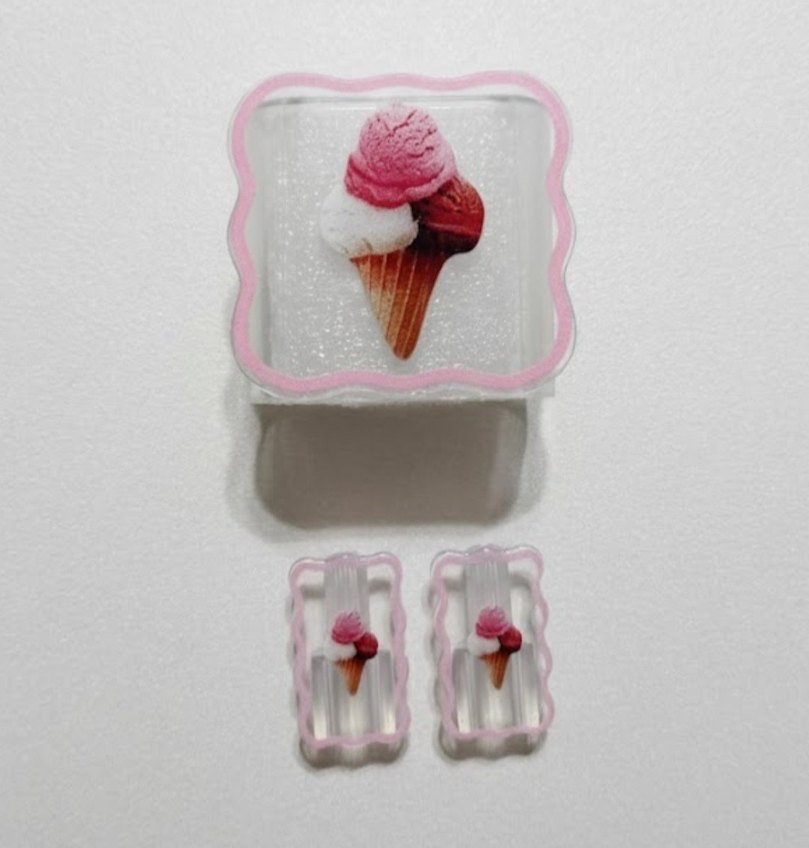Pembe pastel renkte, dondurma desenli ve dalgalı kenarlı adaptor ve kablo koruma basliklari , toplam 3 parça ( adaptir ve kablo gorsel amaclidir fiyata dahil degildir )