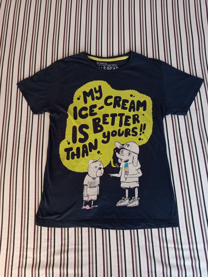 Pamuklu, kısa kollu, bol kesim ve yuvarlak yaka, eğlenceli baskı detayli. baskida ' benim dondurmam seninkinden daha yağli' yaziyor. uzun yillar kullanabilirsiniz.