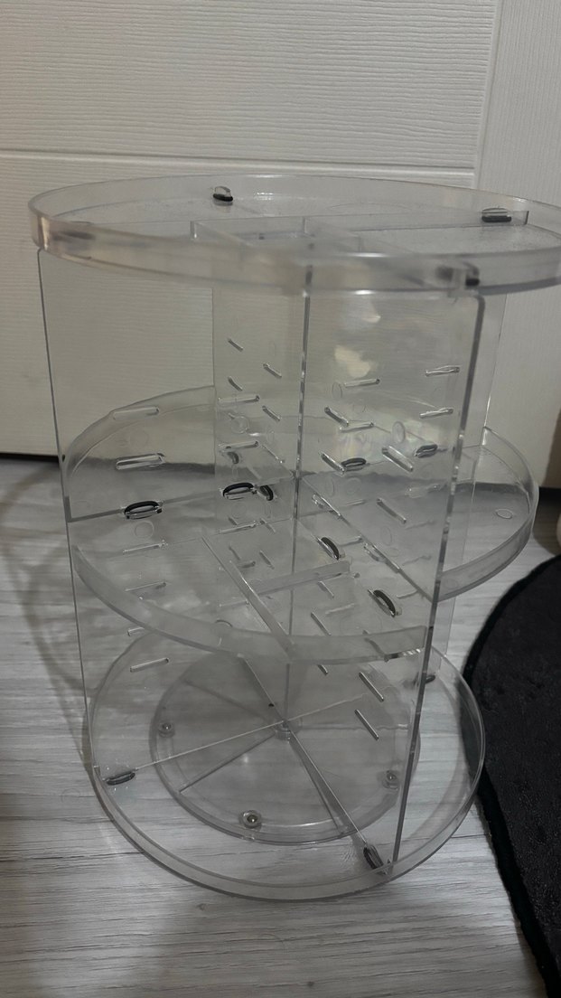 Dönen şeffaf bölmeleriyle makyaj ürünlerini düzenli ve kolay erişilebilir tutar.