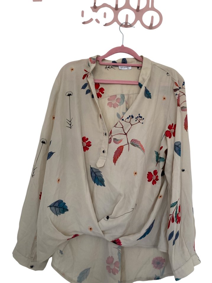 Bej gömlek, bol kesim, uzun kollu ve drapeli tasarıma sahiptir. V yaka ve çiçek desenlidir, bohem tarz için uygundur. 46 beden salaş cok havali bir model