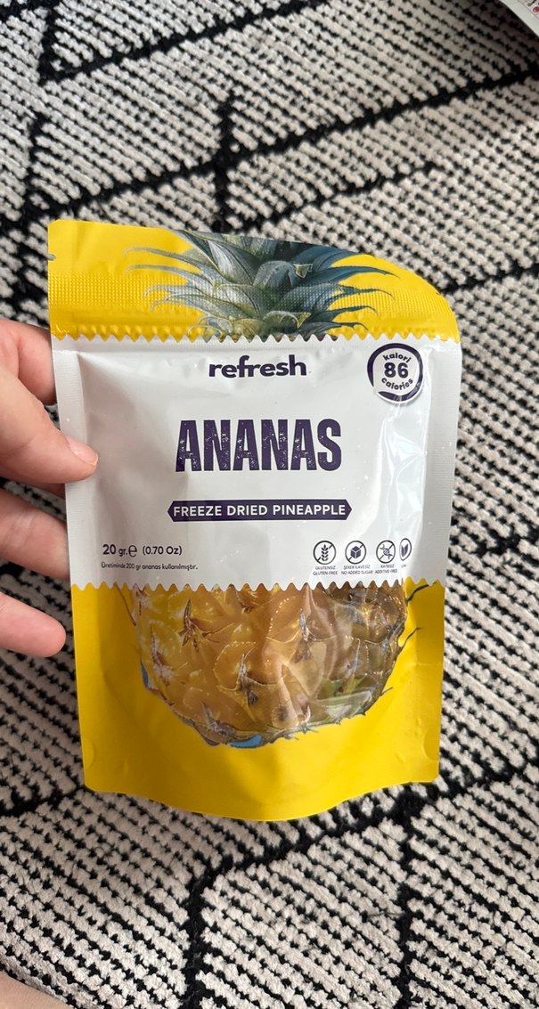 Refresh markasına ait, 86 kalorili 20 gram donmuş kurutulmuş ananas köpek ödülü. Doğal ve sağlıklı atıştırmalık seçeneği sunar. Toz değildir tanelidir çoklu alımda indirim yapılır kendi sitesinde 120₺ den başlıyor bu ürünler