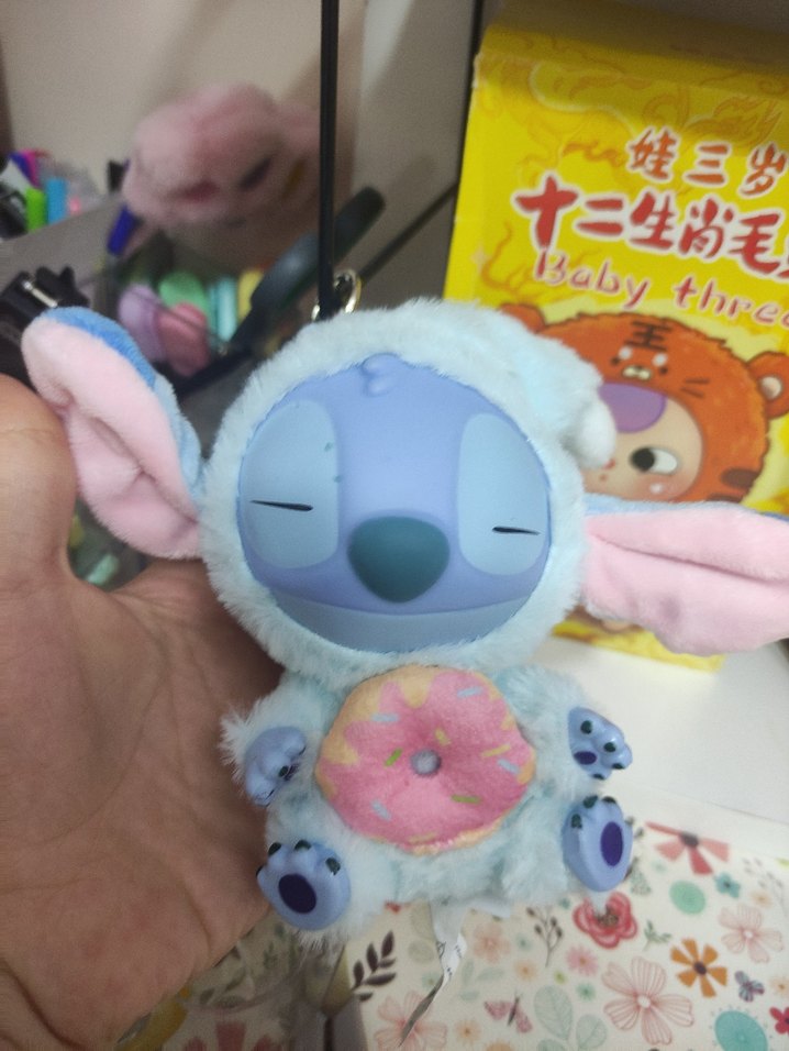 Pastel renklerde, pembe simit tutan çok renkli bir peluş oyuncak anahtarlık. Yumuşak kumaş ve kapalı gözleriyle sevimli ve uykulu bir görünüme sahip.