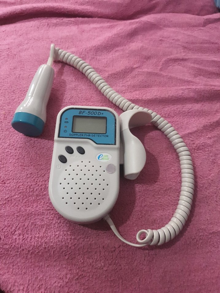Renkli prob ve dijital ekranlı beyaz Doppler fetal kalp atış monitörü. Sadece arka pil kapağı ve adaptörü mevcut değildir,çalışmasında hiçbir sorun yoktur.
