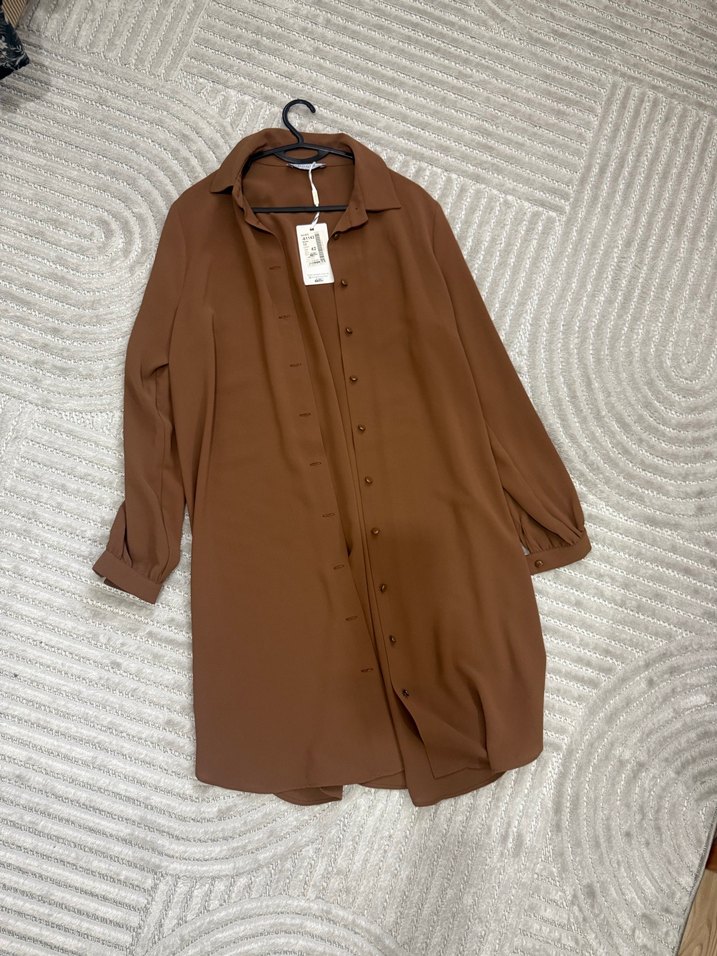 Kahverengi, uzun boy kadın tunik, düğmeli önü ve yakalı tasarımıyla rahat bir görünüm sunar. İpeksi kumaştan, uzun kollu ve desen içermeyen sade bir modeldir. Mükemmel bir kumaşı var doğumdan sonra kilo aldım giyemedim. İki koltuk altı 55 boy 105