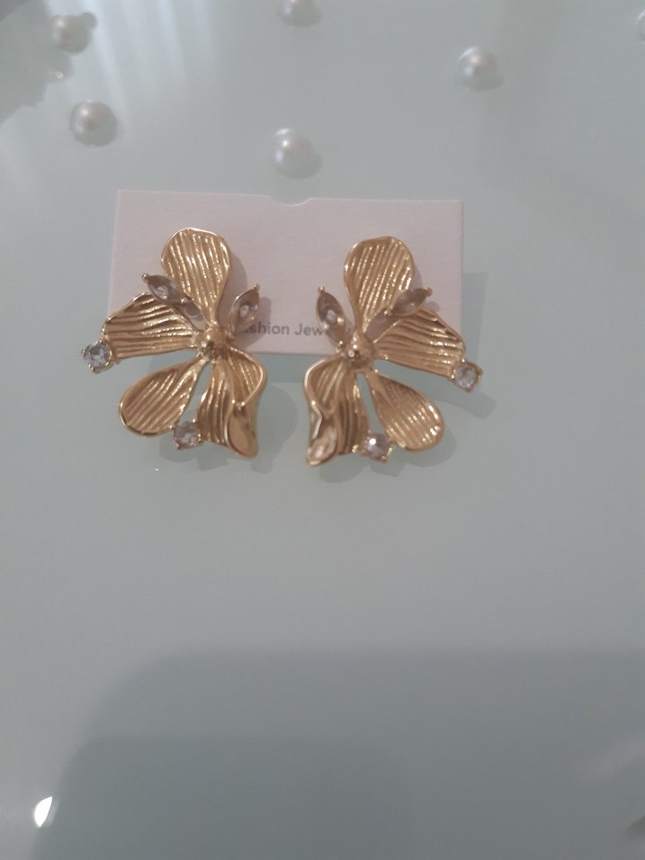 Parlak dore renkte, işlemeli mini çiçek desenli kısa uzunlukta küpeler. Düğün için uygun, çağdaş ve klasik zarafeti yansıtan tasarım.