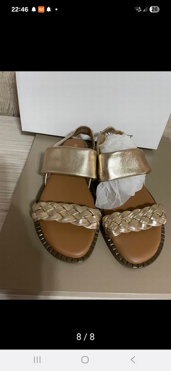 Altın renkli deri düz sandalet, 40 no ama dar kalıptır. 39 no ince ayaklar tercih edebilir. Bundan dolayı 39 no işaretlenmiştir.