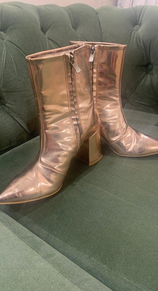 Altın parlak deri kadın botları,yan fermuar ve kare altın topuk , çağdaş şık ve elit tarzı yansıtıyor. İtalyan dar kalıp,36 numara için daha uygun.Topuk boyu 7,5cm,bot uzunluk15cm,en 12cm SON FİYAT