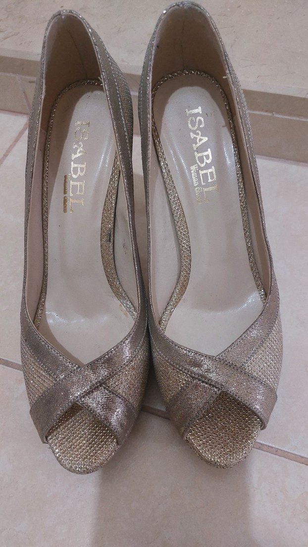Dore renkli, parlak yılan desenli ve sim detaylı kadın topuklu ayakkabı. İpek gibi yumuşak malzemeden, şık düğünler için uygun. ✨36 numara.