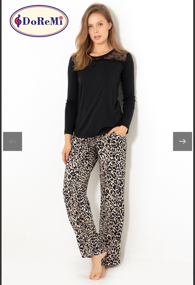 Doremi kadın pijama takımı, dantel detaylı siyah uzun kollu üst ve zebra desenli pantolon ile rahat ve yumuşak kumaştan üretilmiştir.