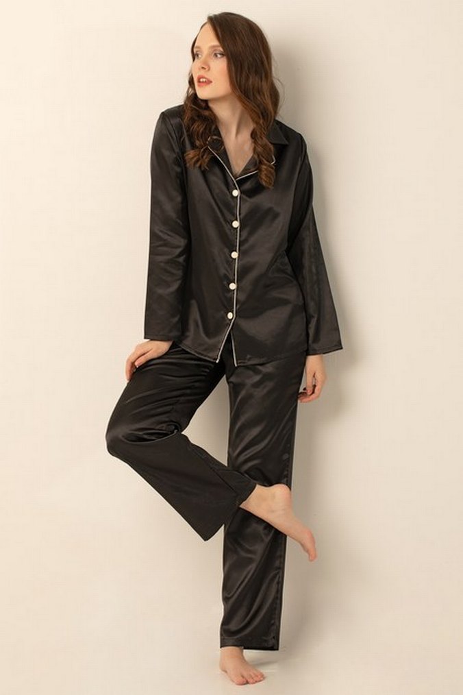 DoReMi Uzun Kollu Saten Pijama Takımı Göz alıcı tasarımı ile şık ve çekici stilini zirveye taşıyabilirsin! Günün her anında daha çekici görünmek isteyen kadınlar için büyük bir özenle tasarlanmıştır. Şık detaylarıyla ve saten kumaşının büyüleyici dokusuyla seni kendine hayran bırakır. Uzun kollu ve düğmeli bir gömlek ile ayak bileklerinde biten bir pijamadan oluşur. %100 Polyester.