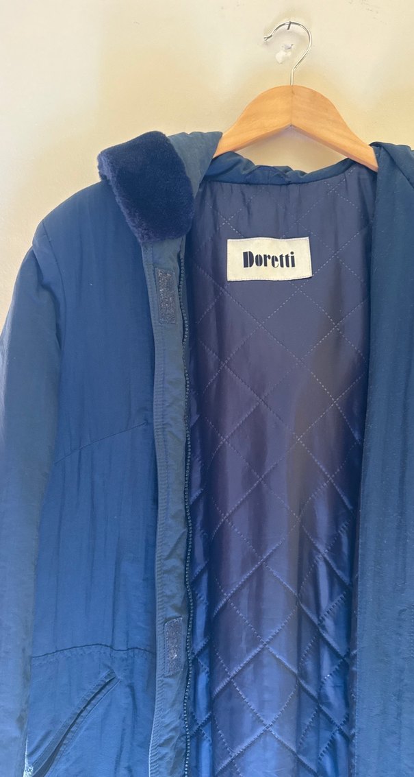 Doretti marka, kürklü detaylı, koyu mavi midi uzunlukta, uzun kollu, yumuşak ve sıcak kumaştan yapılmış, oturan kesim kadın ceket.