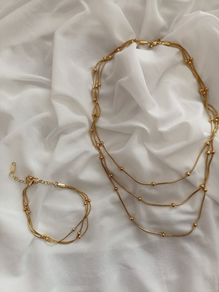 Uzun uzun zincir detaylı, parlak altın renkli ve hafif yılan desenli bohem tarzda dorika kolye ve bileklik