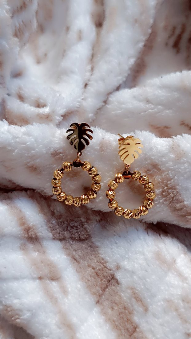 Altın renginde, yaprak şeklinde saplarla boncuklu halka tasarıma sahip, bohem ve rahat tarza uygun mini küpeler.