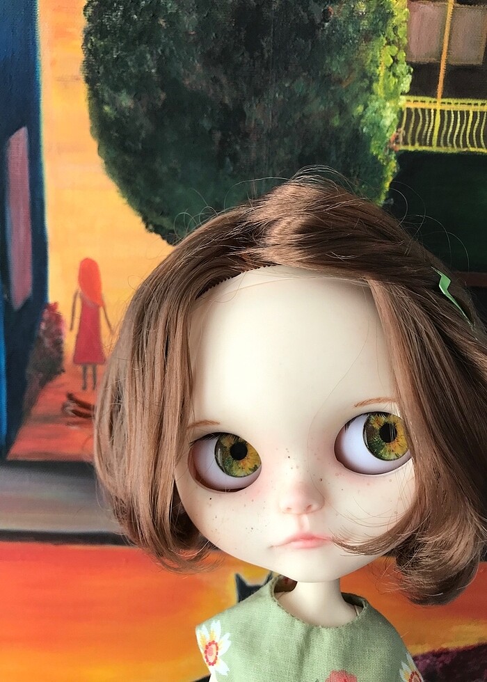 Dudak , burun ve çeneyi yeniden şekillendirdim. Gözleri cam göz olarak değiştirdim ve ipek kirpik taktım. Kıyafeti ve oyuncağı özel tasarladım. Yüzünü vernikledim makyajı sabitledim ancak yine de yıkama silme vs önermiyorum. Oyuncak değildir.