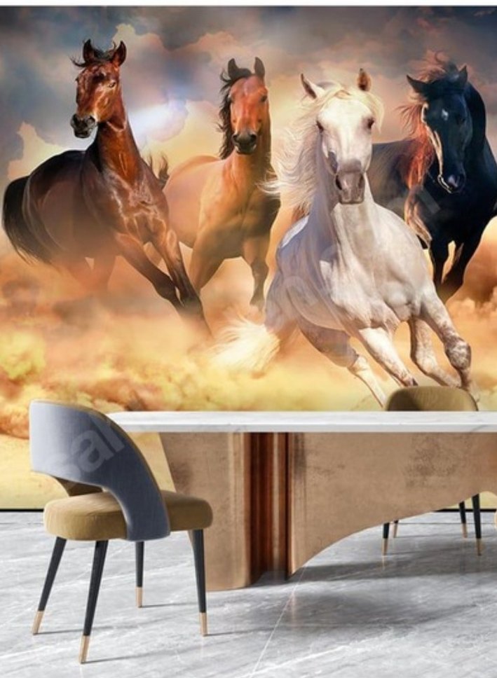 Dört Atlı Duvar kumaş poster kahverengi beyaz atlar arka plan sarı tüm duvarı kaplar yirtilmaz yipranmaz eskimez su gecirmez ses yalitimi ölçüleri 2.50 3.00 istenilen olcude yapilir