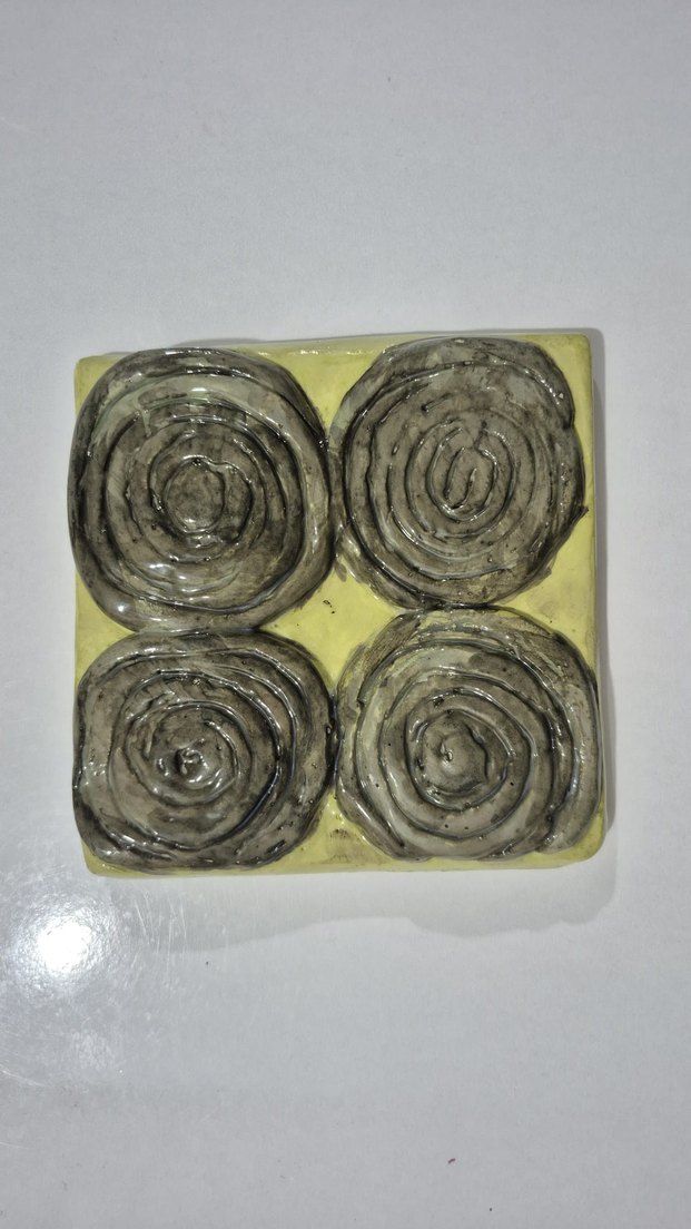 Sarı zemin üzerinde dört adet gri dairesel desenli, kabartmalı el yapımı tablo