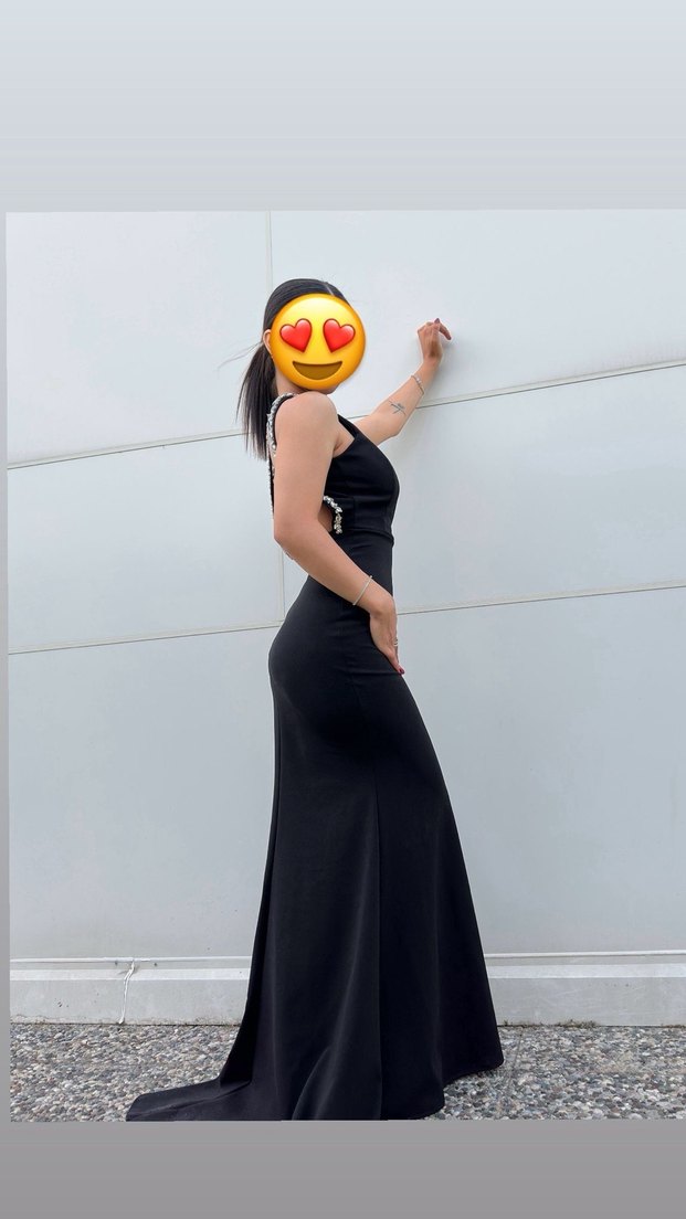 Uzun siyah elbise, halter ve askılı kollara sahip, vücuda oturan kesimiyle drapeli şık bir görünüme sahiptir. Cesur, gotik parti tarzı için uygundur.