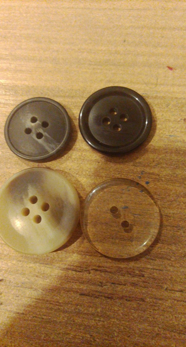 Farklı renk ve malzemelerden yapılmış, iki ve dört delikli dört düğme seti.