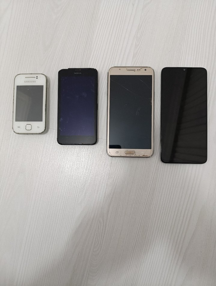 beyaz olan Samsung la nokiya ekranı açılıyor diyer ikisi ekranı açılmıyor hiç biri tamir görmemiştir açılmamıştır içleri xiaomo suya düştü
