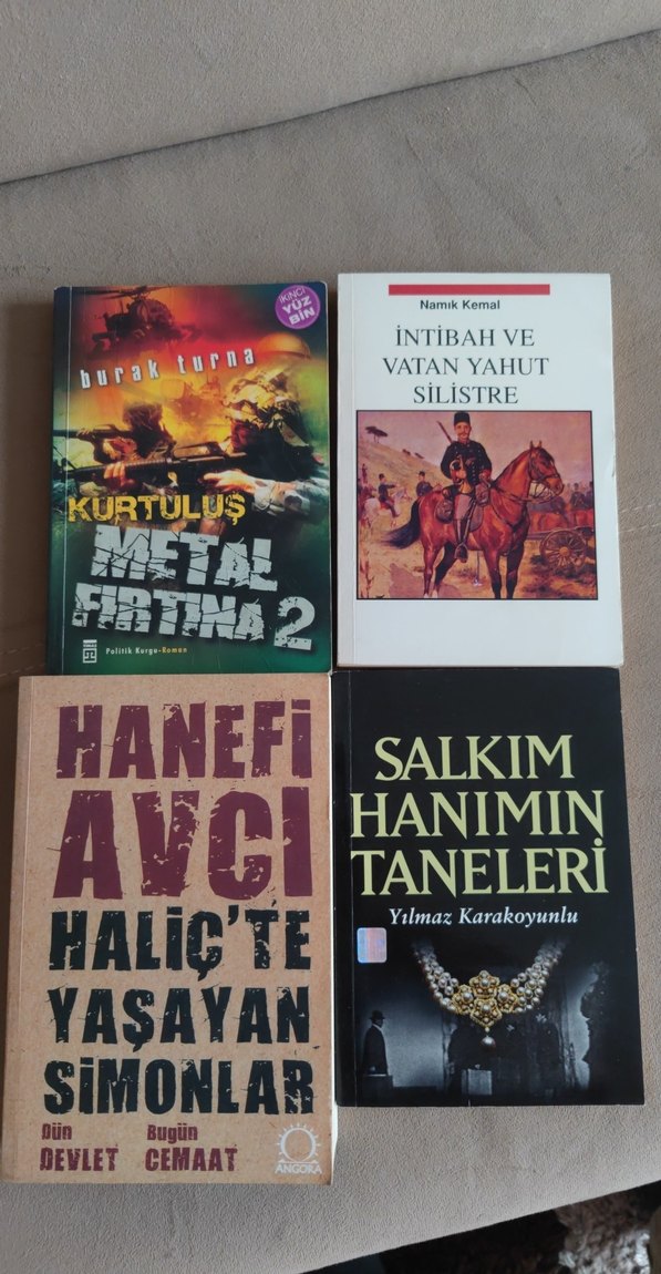Burak Turna'dan 'Kurtuluş Metal Fırtına 2', Namık Kemal'den 'İntibah ve Vatan Yahut Silistre', Hanefi Avcı'dan 'Haliç'te Yaşayan Simonlar' ve Yılmaz Karakoyunlu'dan 'Salkım Hanımın Taneleri' kitapları seti.