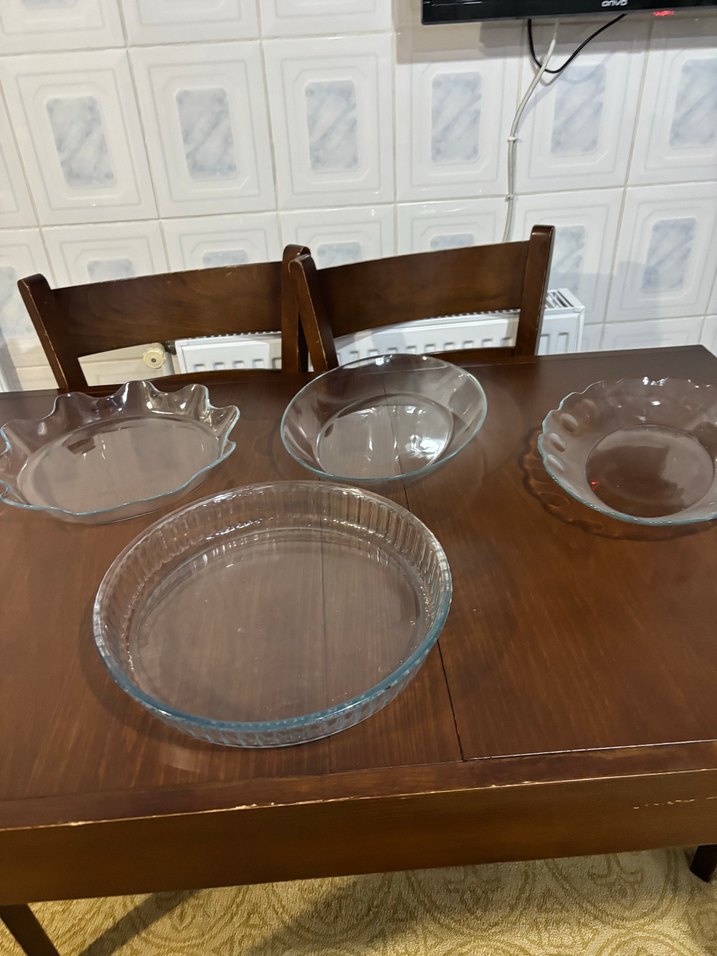 Çeşitli şekillerde dört adet cam fırın kabı seti. Konvansiyonel sofra kullanımı için uygundur.salata kasesi 80 tl parca başı , borcam 130 tl dir isteyene tekli satılır