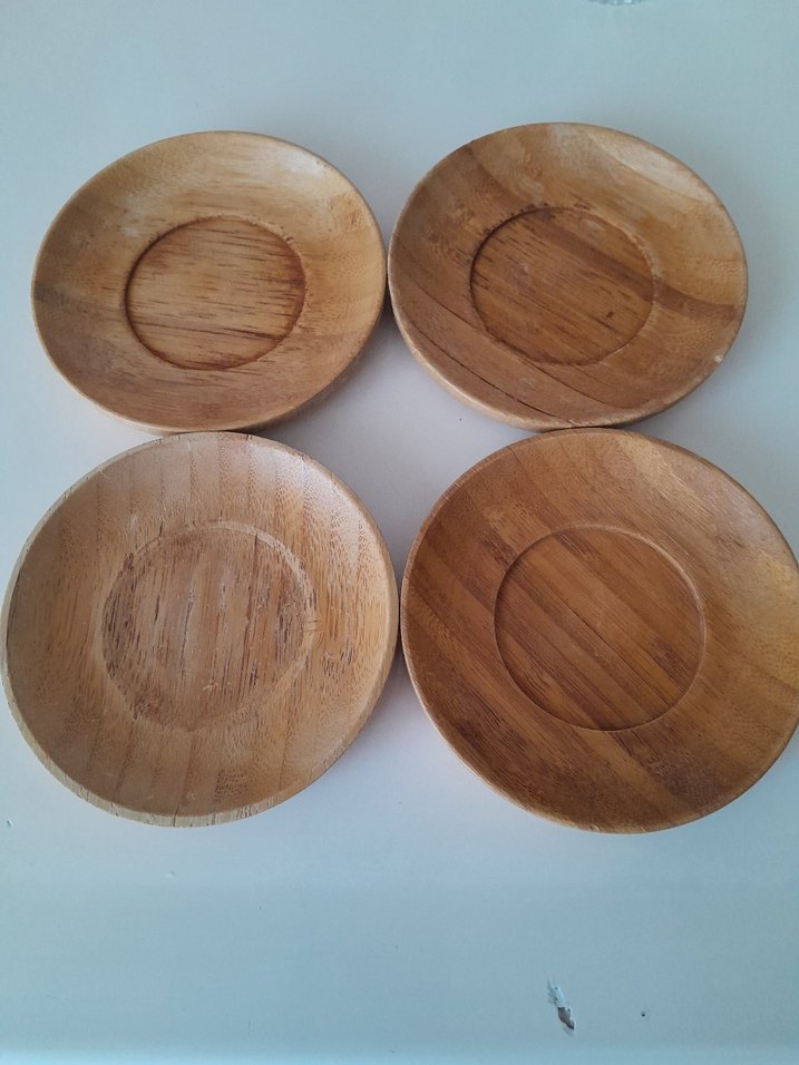 Dört parçadan oluşan, parlak bej renkte, sade desensiz ahşap tabak seti. ️