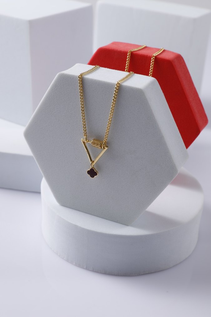 Eonis’in simgesel tasarımı Charm Kilidi, bu kez bordo dört yapraklı yonca ile buluşuyor. Üçgen form, dönüşümü ve dengeyi temsil ederken; yonca, şans ve içsel huzurun enerjisini taşır. Zarif detaylarıyla hem anlamlı hem de göz alıcı bir parça. ✨ Malzeme: 925 ayar gümüş, 18K altın kaplama