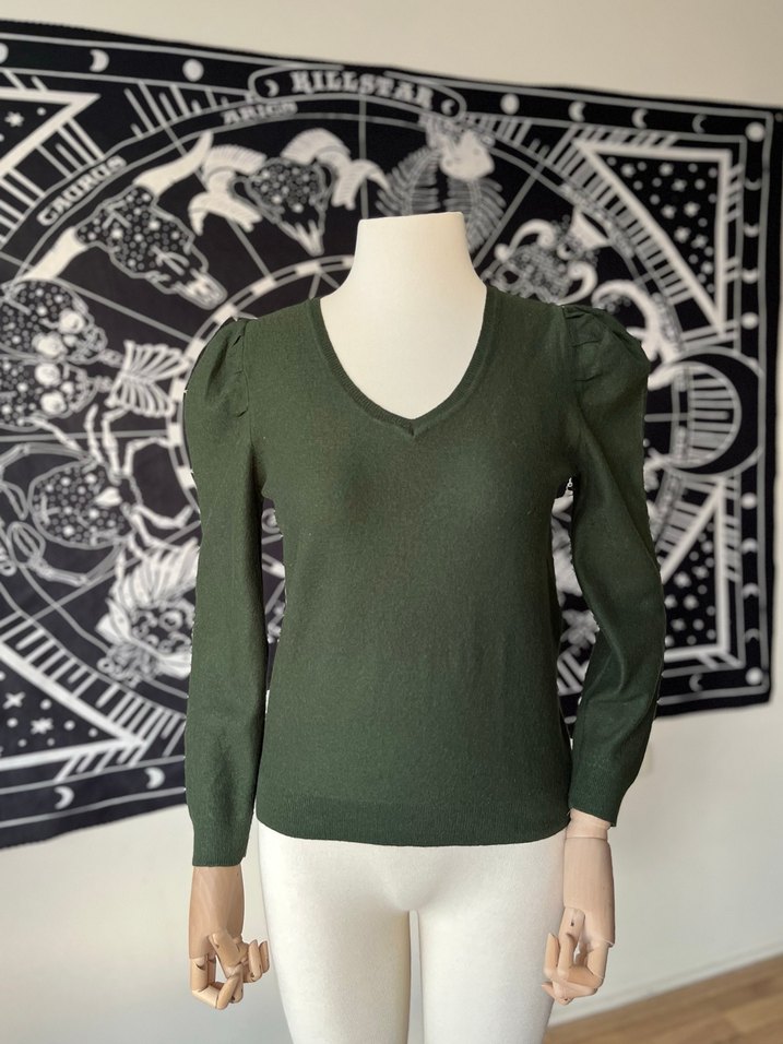 Dörtel haki kazak. Sıcak tutar kış ayları için ideal. S beden mankende duruşu bu şekilde. İki koltuk altı arası 45 cm, uzunluğu 52 cm