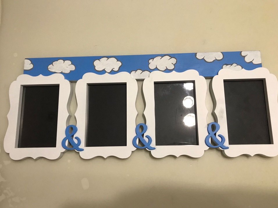 Beyaz zemin üzerinde beyaz bulut desenleri ve mavi & işareti detaylı dörtlü beyaz çerçeve ☁️ 10x15 normal fotoğraf boyutu. El boyaması.