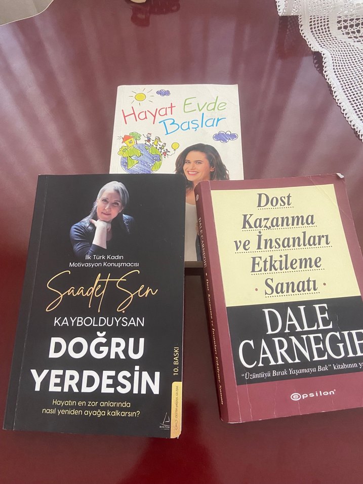 Üç kitaplık set; 'Hayat Evde Başlar', Saadet Şen'in 'Kayboldysan Doğru Yerdesin' ve Dale Carnegie'nin 'Dost Kazanma ve İnsanları Etkileme Sanatı' kitaplarını içerir.
